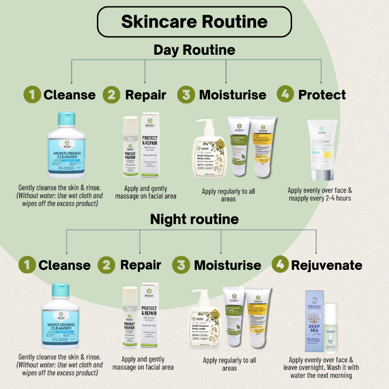 Skincare Skincare focuses on maintaining healthy skin by cleansing, hydrating, and protecting it to support the skin barrier, prevent irritation, and address concerns such as dryness, sensitivity, acne, or eczema. Recommended Products Day Routine Night Routine Cleanse Repair Moisturise Protect REMDII® Moisturising Cleanser 135ml RM23.00 Add to cart REMDII® Daily Resurging Face Serum 30g RM100.00 Add to cart REMDII® Sensitive Daily Intensive Moisturising Cream RM12.00 - RM85.00 Select Options REMDII® Ultra Sensitive Daily Advance Intensive Barrier Repair Cream RM18.00 - RM80.00 Select Options REMDII® Multi-Vitamins Daily Lotion RM48.00 - RM78.00 Select Options REMDII® Hydrating Anti-Photoaging Sunscreen 40ml RM48.00 Add to cart Cleanse Repair Moisturise Protect REMDII® Moisturising Cleanser 135ml RM23.00 Add to cart REMDII® Daily Resurging Face Serum 30g RM100.00 Add to cart REMDII® Sensitive Daily Intensive Moisturising Cream RM12.00 - RM85.00 Select Options REMDII® Ultra Sensitive Daily Advance Intensive Barrier Repair Cream RM18.00 - RM80.00 Select Options REMDII® Multi-Vitamins Daily Lotion RM48.00 - RM78.00 Select Options REMDII® Deep Sea Rejuvenating Sleeping Mask 30ml RM98.00 Add to cart For More Guidance
